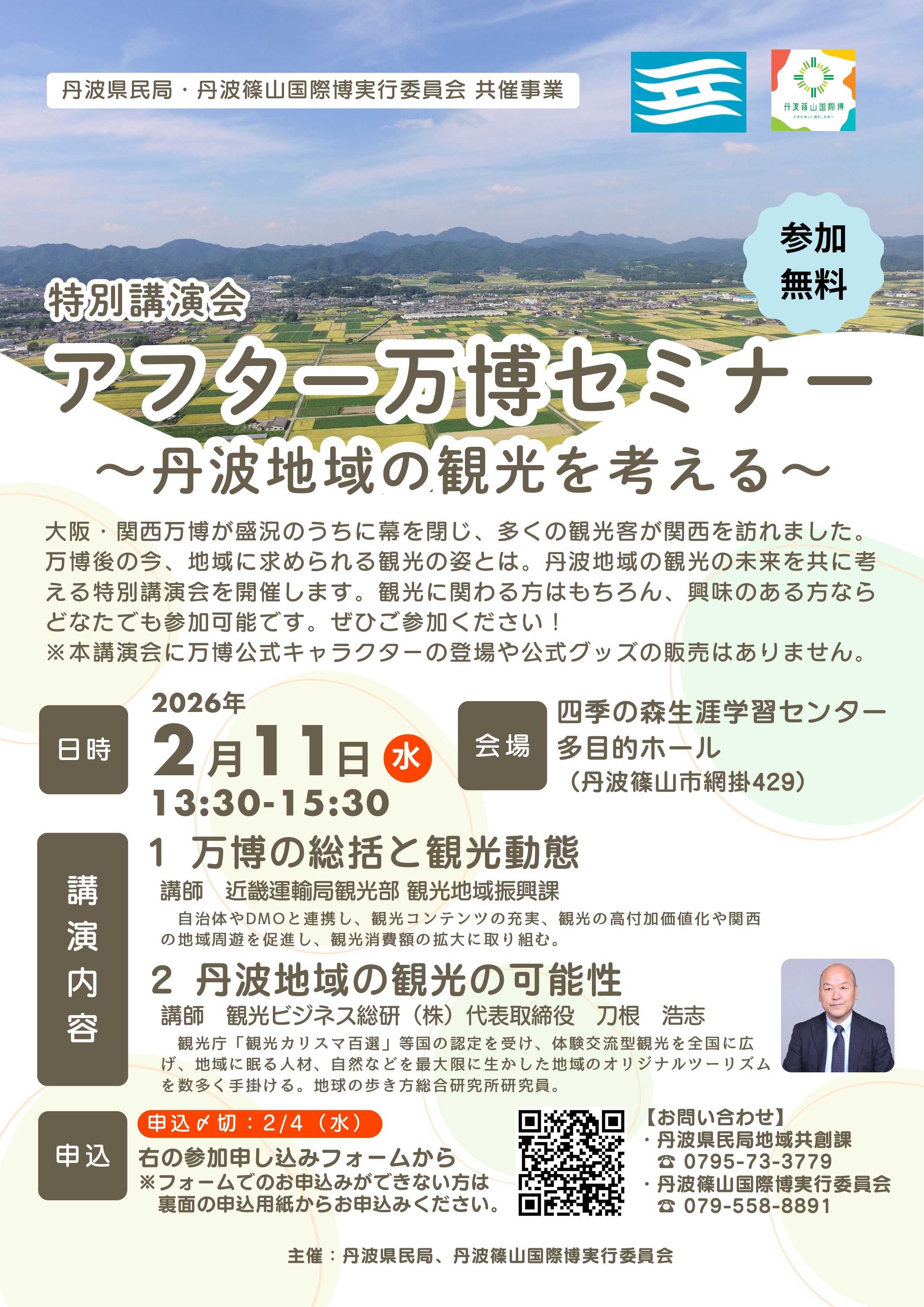 大阪・関西万博が盛況のうちに幕を閉じ、多くの観光客が関西を訪れました。万博後の今、地域に求められる観光の姿とは。丹波地域の観光の未来を共に考える特別講演会を開催します。観光に関わる方はもちろん、興味のある方ならどなたでも参加可能です。ぜひご参加ください! ※本講演会に万博公式キャラクターの登場や公式グッズの販売はありません。