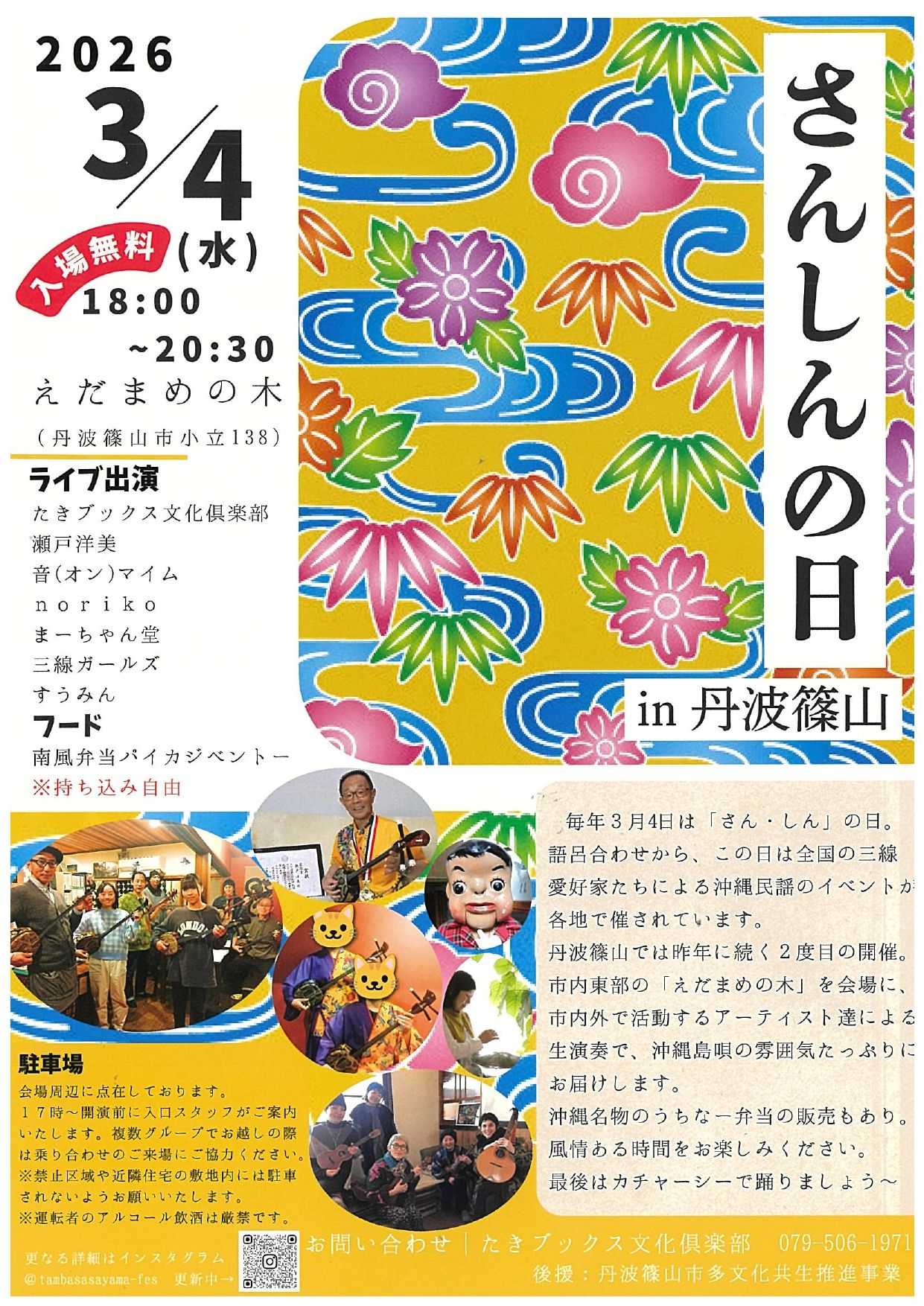 毎年3月4日は「さん・しん」の日。 語呂合わせから、この日は全国の三線愛好家たちによる沖縄民謡のイベントが各地で催さ れています。 丹波篠山では昨年に続く2度目の開催。 市内東部の「えだまめの木」を会場に、市内外で活動するアーティスト達による生演奏で 、沖縄島唄の雰囲気たっぷりにお届けします。 沖縄名物のうちなー弁当の販売もあり。 風情ある時間をお楽しみください。 最後はカチューシーで踊りましょう~